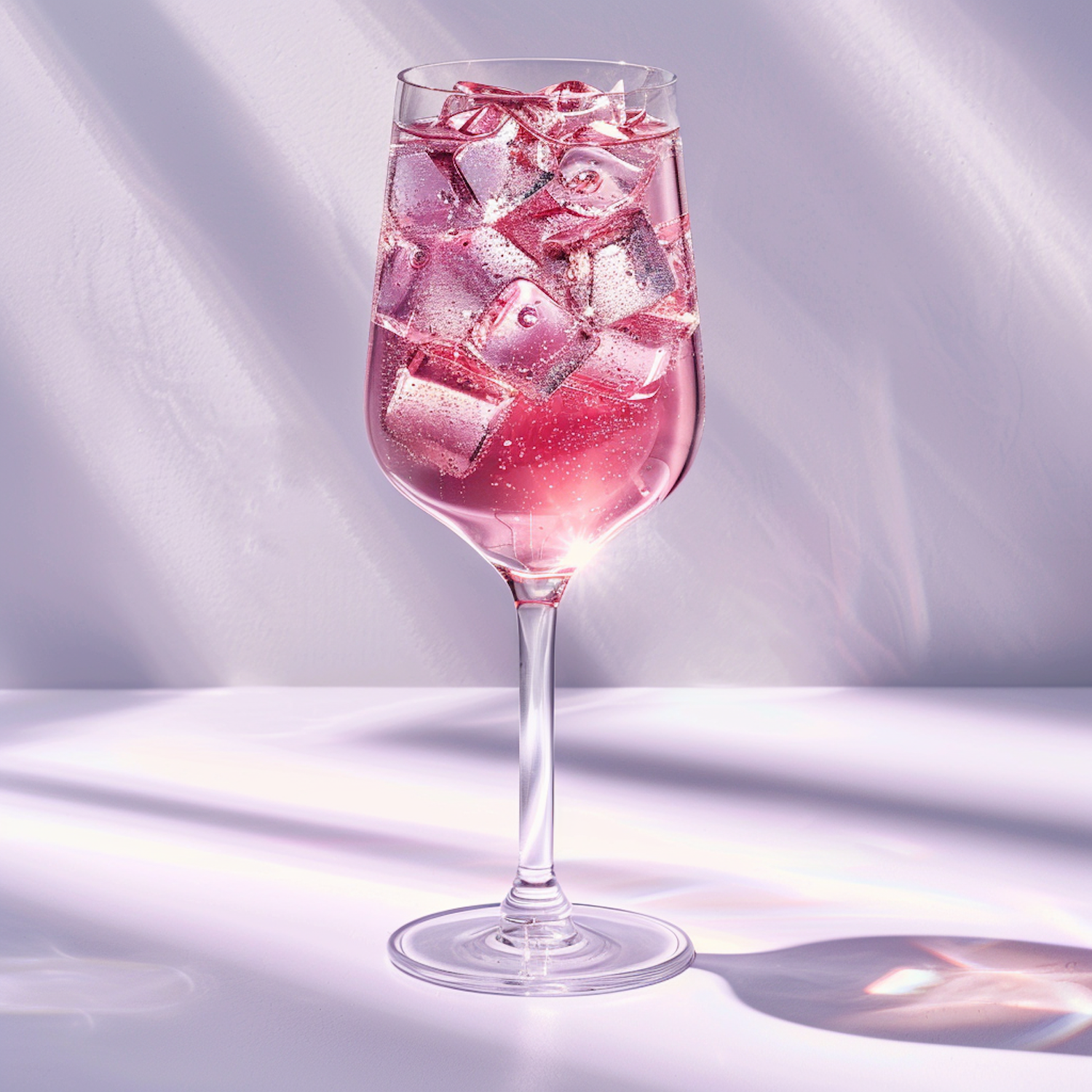 Elegant wine glass with sparkling pink drink, ice cubes, and effervescent bubbles against a pastel background. Refreshing and luxurious.