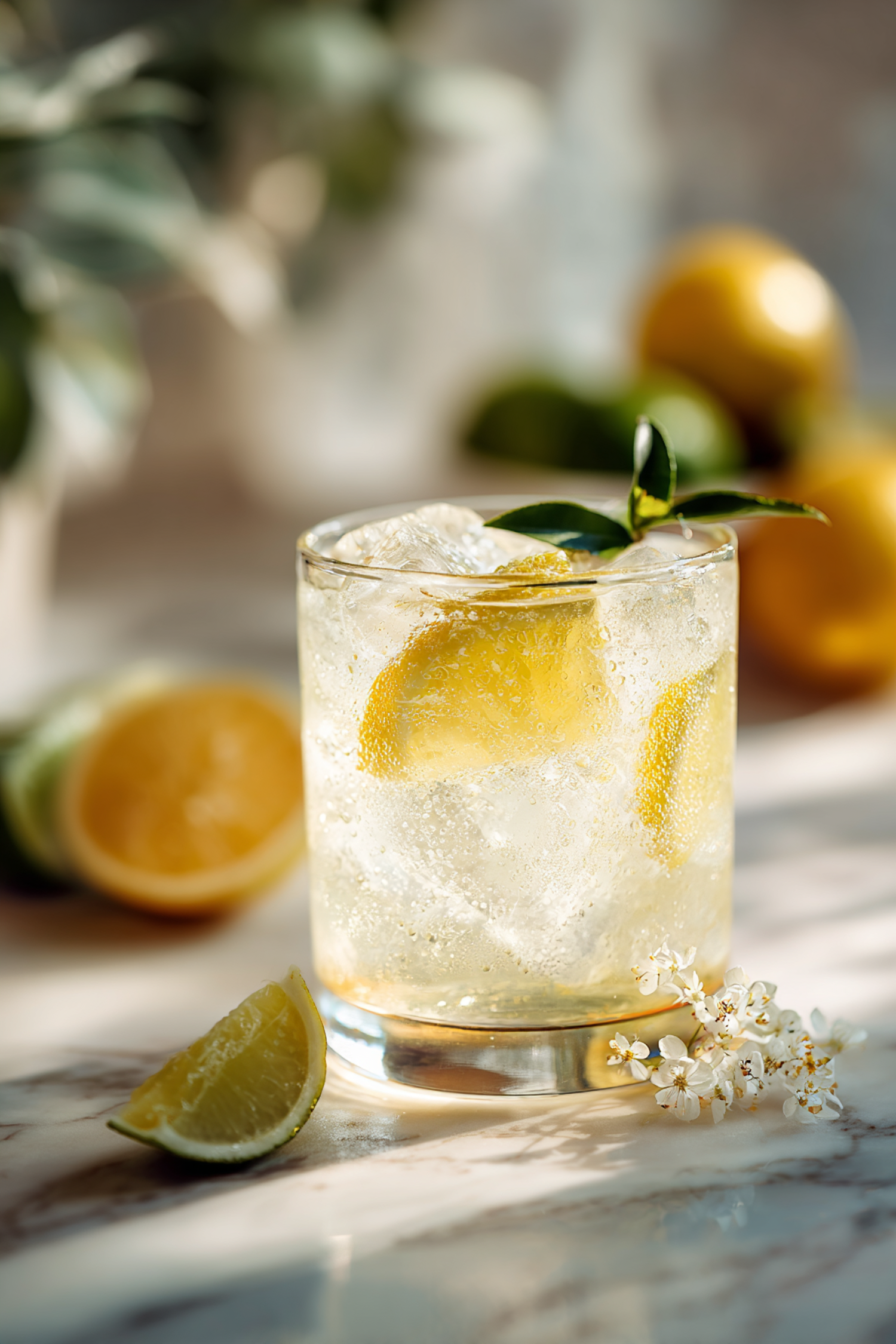 A refreshing glass of sparkling water with lemon slices and ice, surrounded by fresh citrus and flowers on a marble surface.