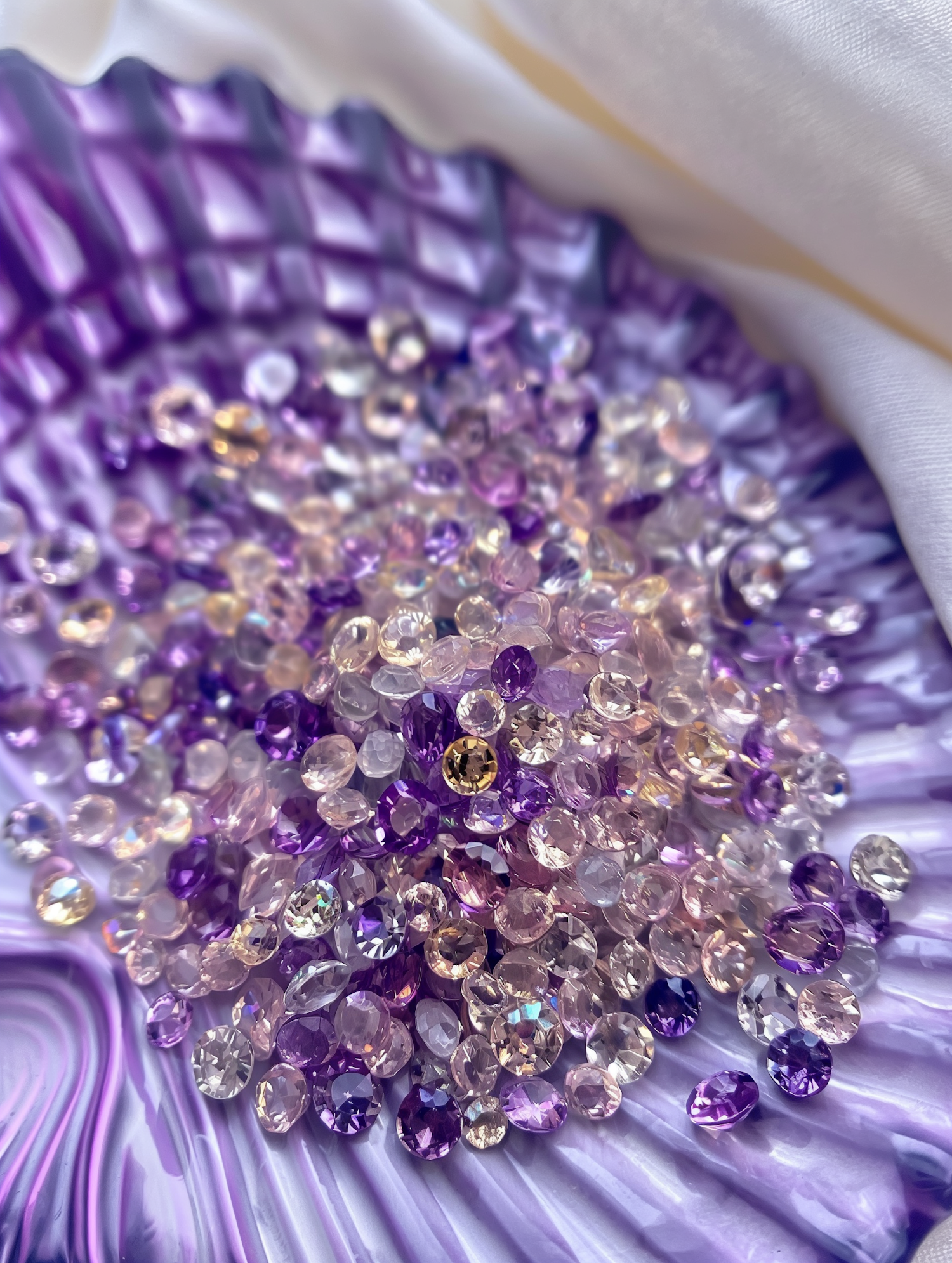 A dazzling array of purple and pink gemstones on a textured purple surface, creating a luxurious and sparkling display.