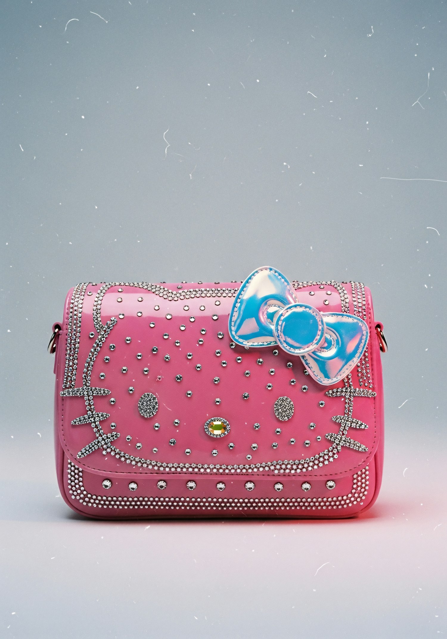 A pink handbag with rhinestone details and a shiny blue bow, designed in the style of a popular cartoon character.