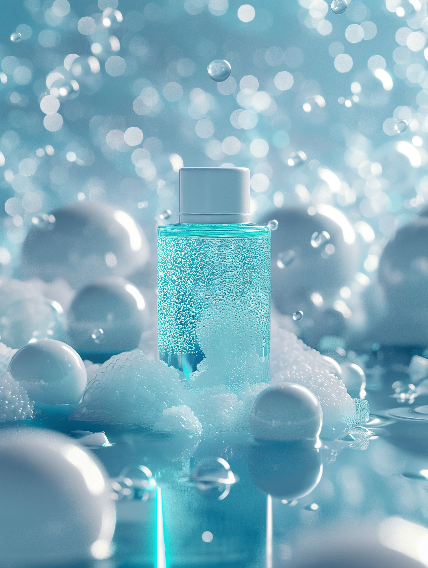 Effervescent blue liquid bottle surrounded by bubbles and foam, set against a dreamy blue bokeh background.