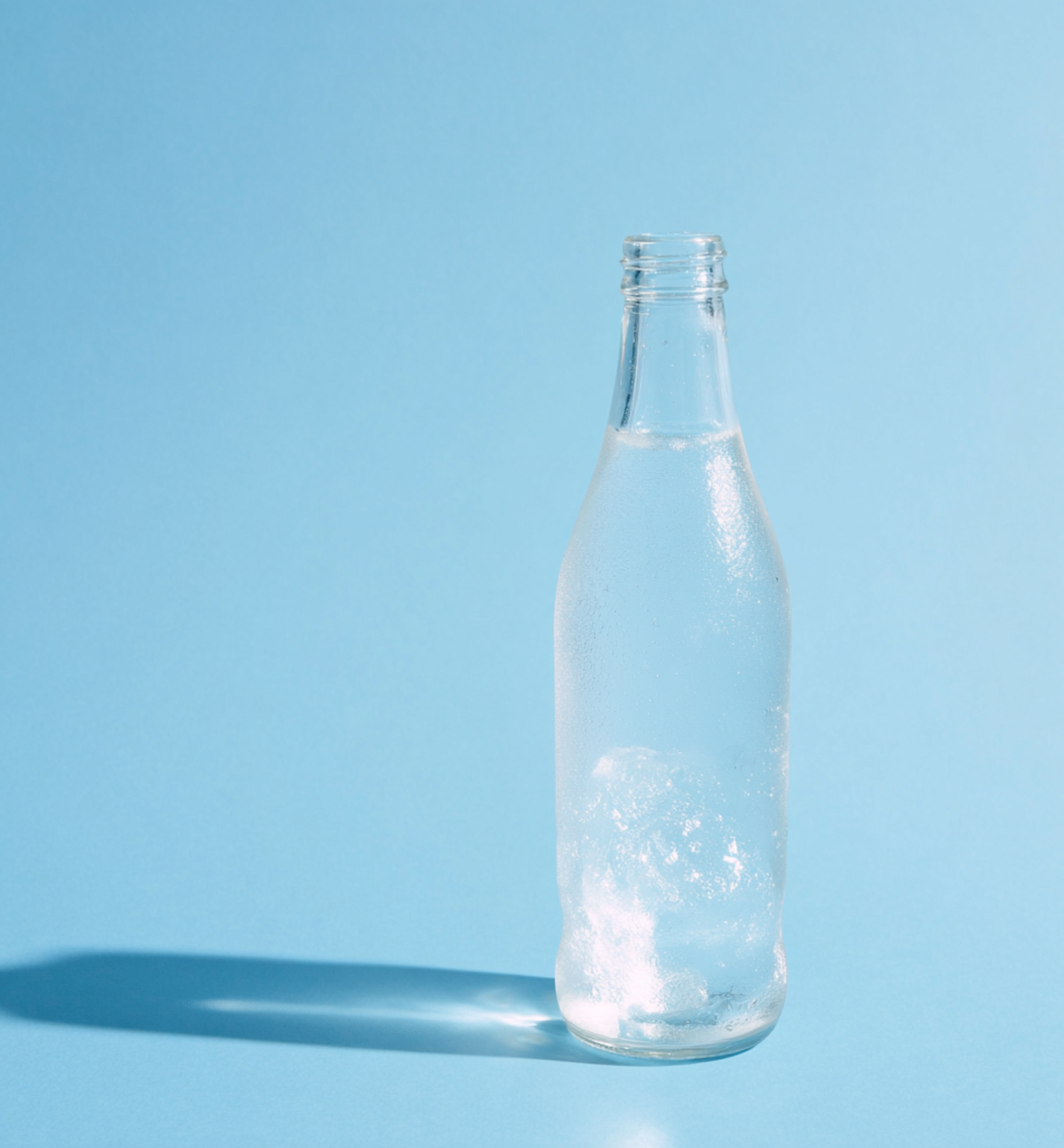 A clear glass bottle of sparkling water on a light blue background, with condensation and bubbles visible, creating a refreshing look.