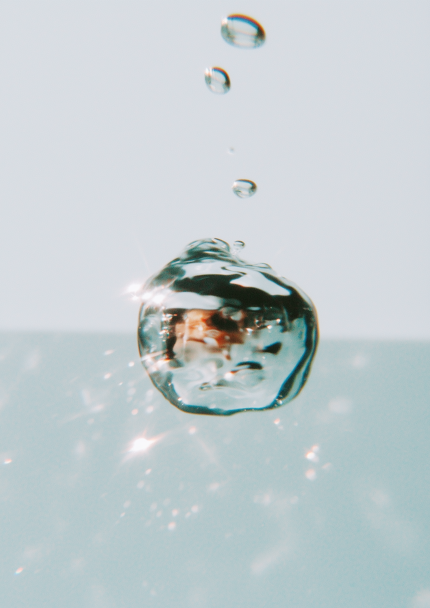 A sparkling water droplet suspended mid-air with light reflections, set against a soft blue background for a serene, minimalistic vibe.