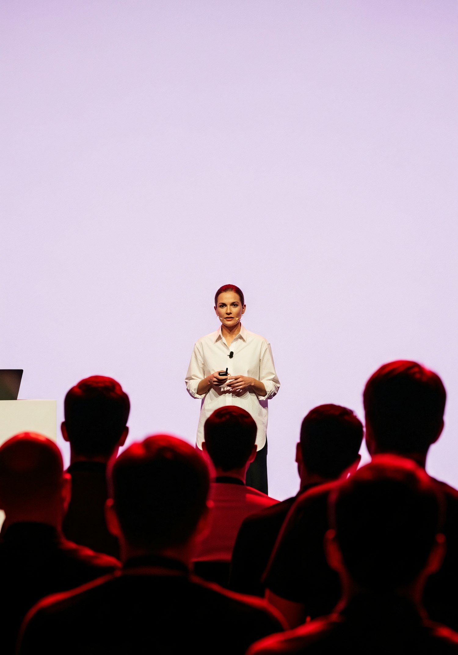 A speaker in a white shirt presents to an audience under red lighting, set against a minimalistic light background.
