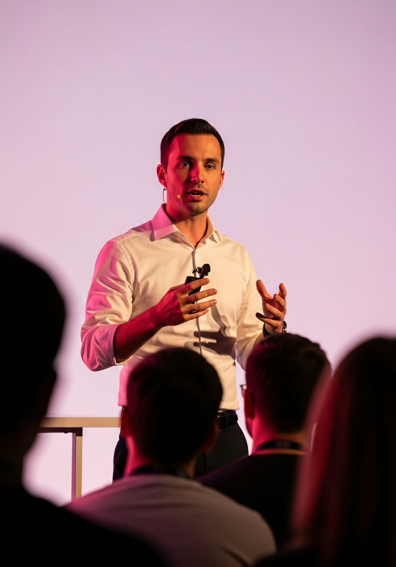 A speaker in a white shirt engages an audience on stage, set against a pink-lit background, creating a professional atmosphere.