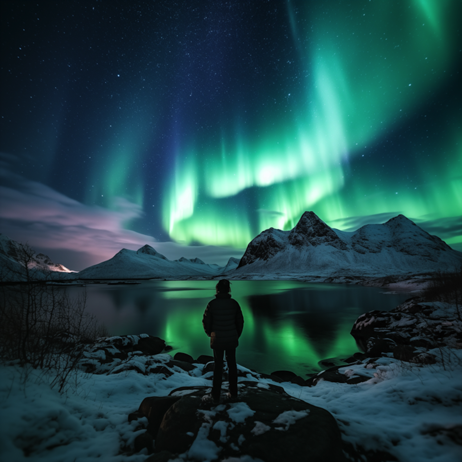 Person stands under vibrant Northern Lights, with snow-capped mountains and starry sky in the background. A serene, awe-inspiring scene.