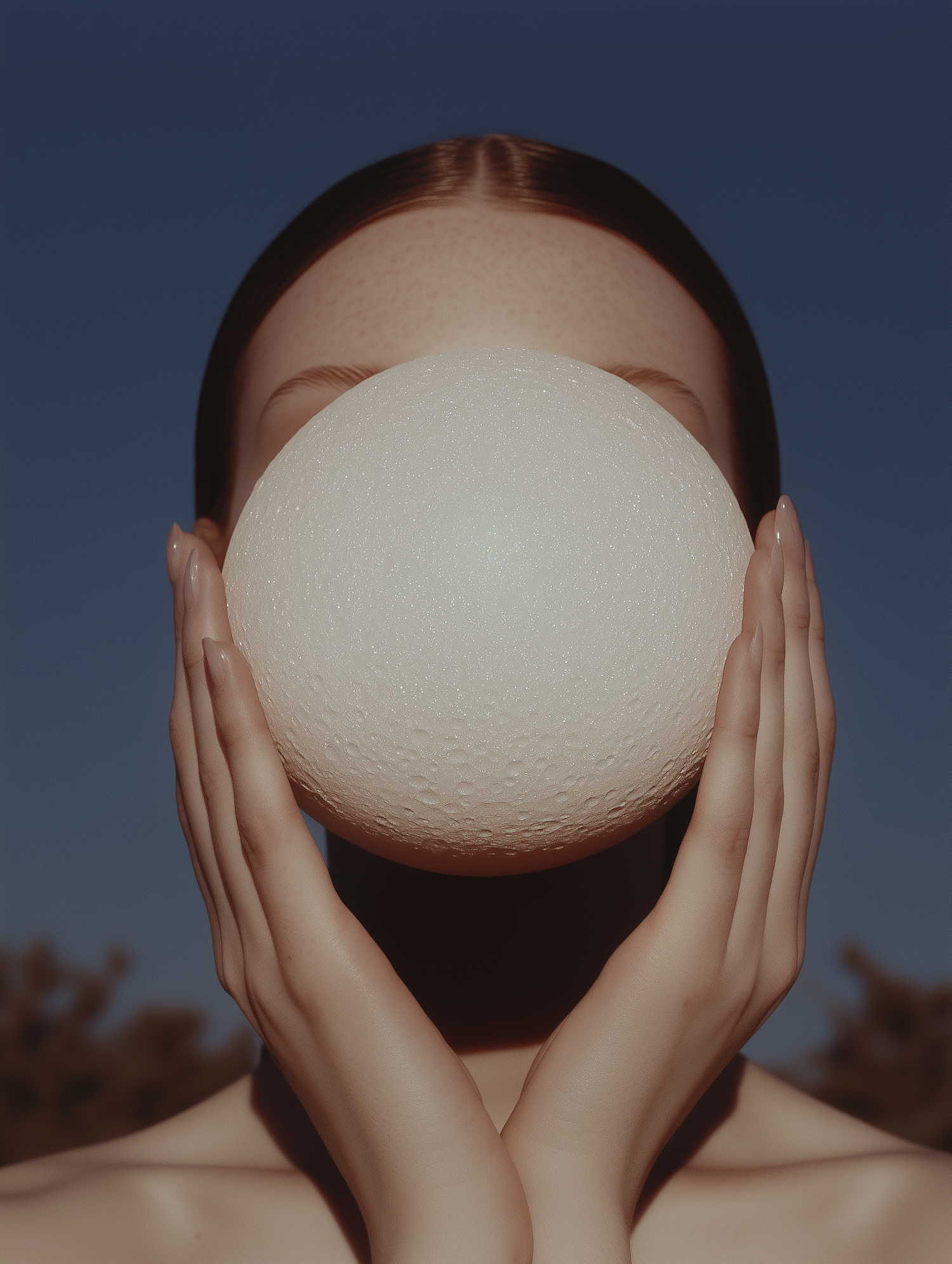A person holds a large white sphere in front of their face against a clear blue sky, creating a minimalist and serene composition.