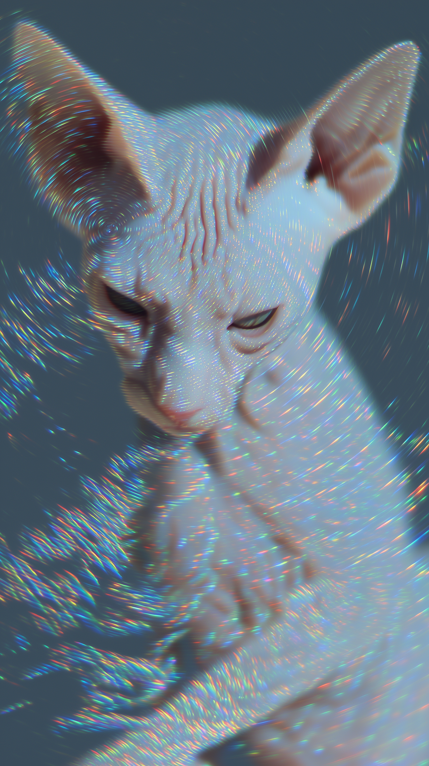 A Sphynx cat bathed in vivid multicolor shimmering lights, creating an otherworldly, ethereal visual effect.