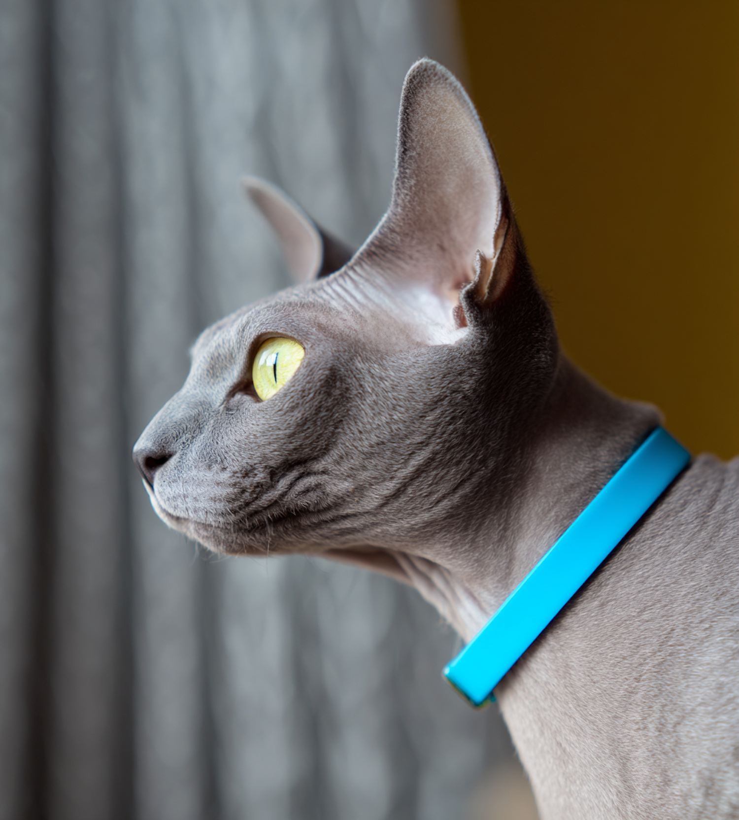 Sphynx cat with striking yellow eyes wears a blue collar while gazing out a window. Graceful profile in soft, natural light.