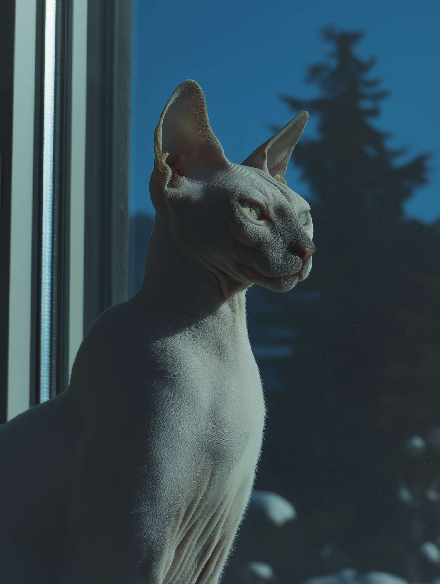 A grey sphynx cat poses elegantly by a window with a serene evening sky in the background.