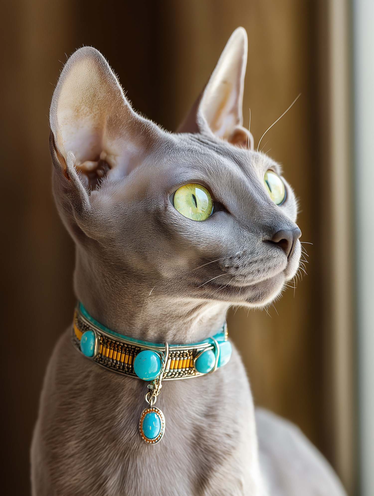 A grey Sphynx cat with enchanting green eyes, wearing an ornate collar with turquoise and gold accents, looking elegantly to the side.