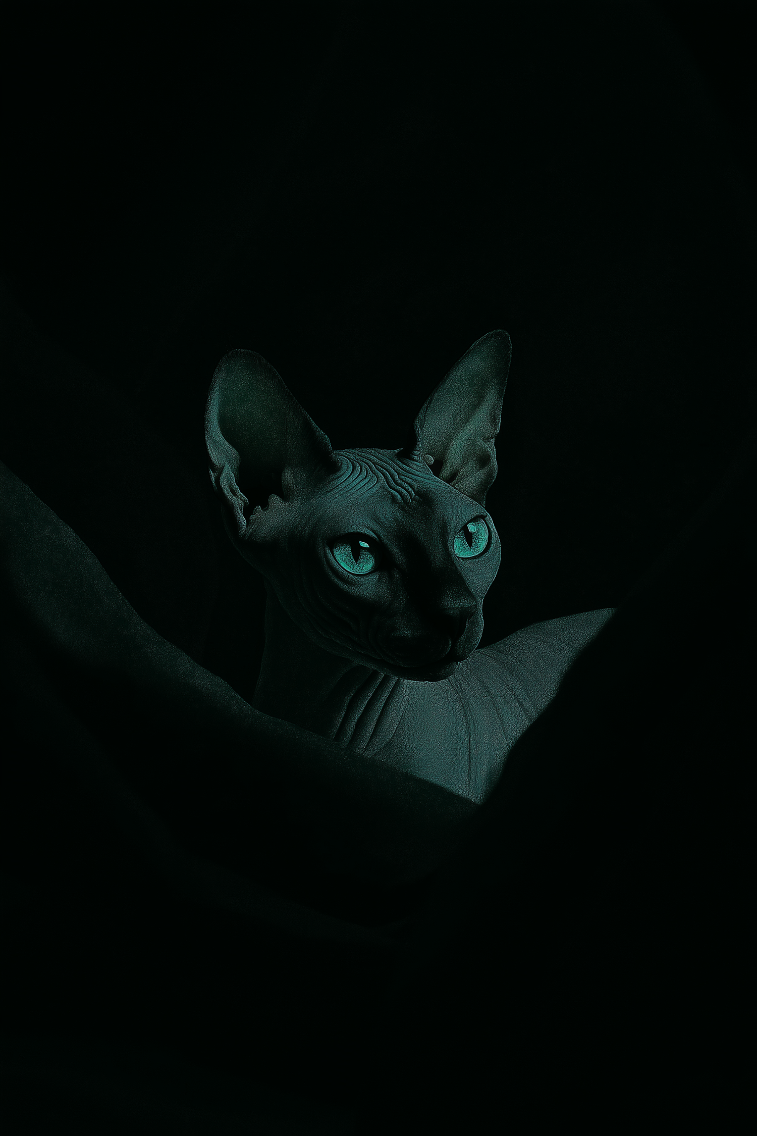 Darkly lit portrait of a grey sphynx cat with glowing green eyes, standing out against a shadowy background. A mysterious and artistic shot.