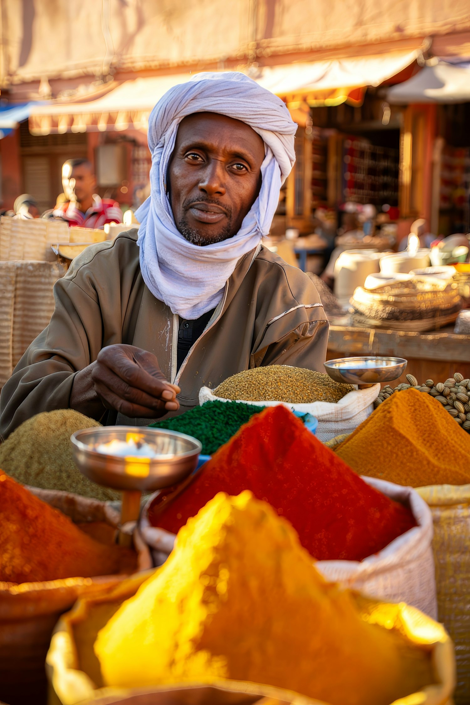 A spice vendor in a vibrant market surrounded by colorful piles of spices, creating a lively and aromatic scene.