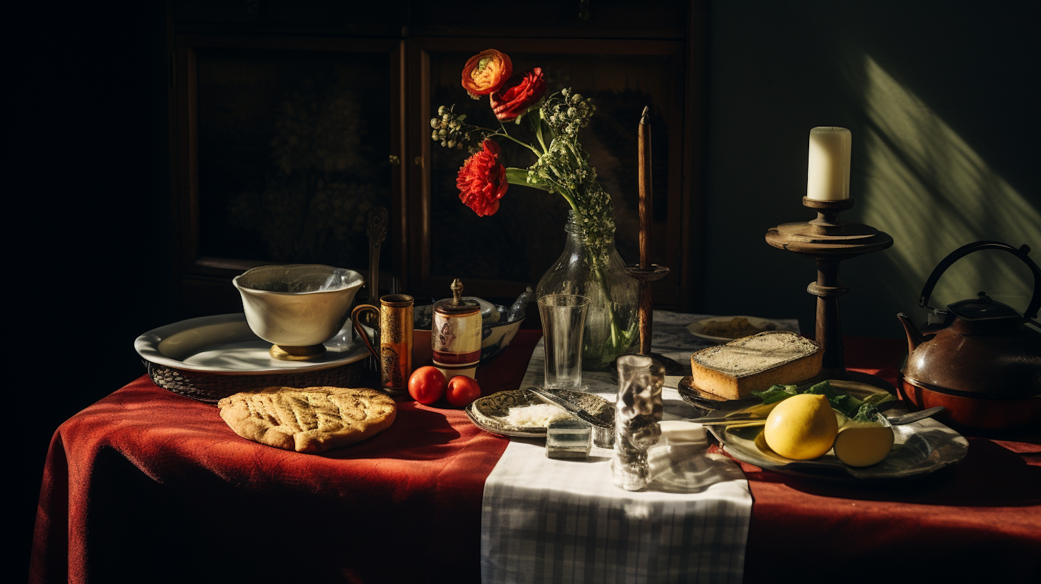 Rustic still life with flowers, bread, and fruit on a red tablecloth. Warm lighting and shadows create a cozy, inviting scene.