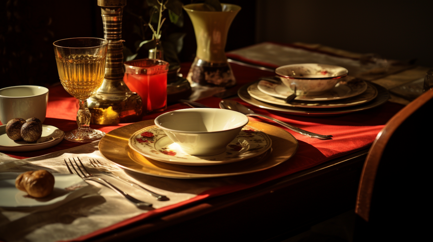 Elegant dining table set with floral china, crystal goblet, and pastries on a red tablecloth, creating a warm, inviting atmosphere.