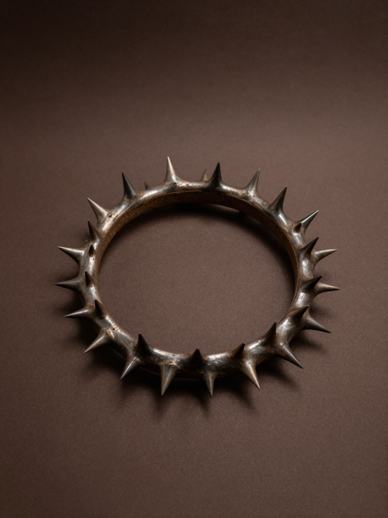 A metallic spiked ring with a rustic finish displayed on a plain brown background, showcasing its sharp details and aged texture.