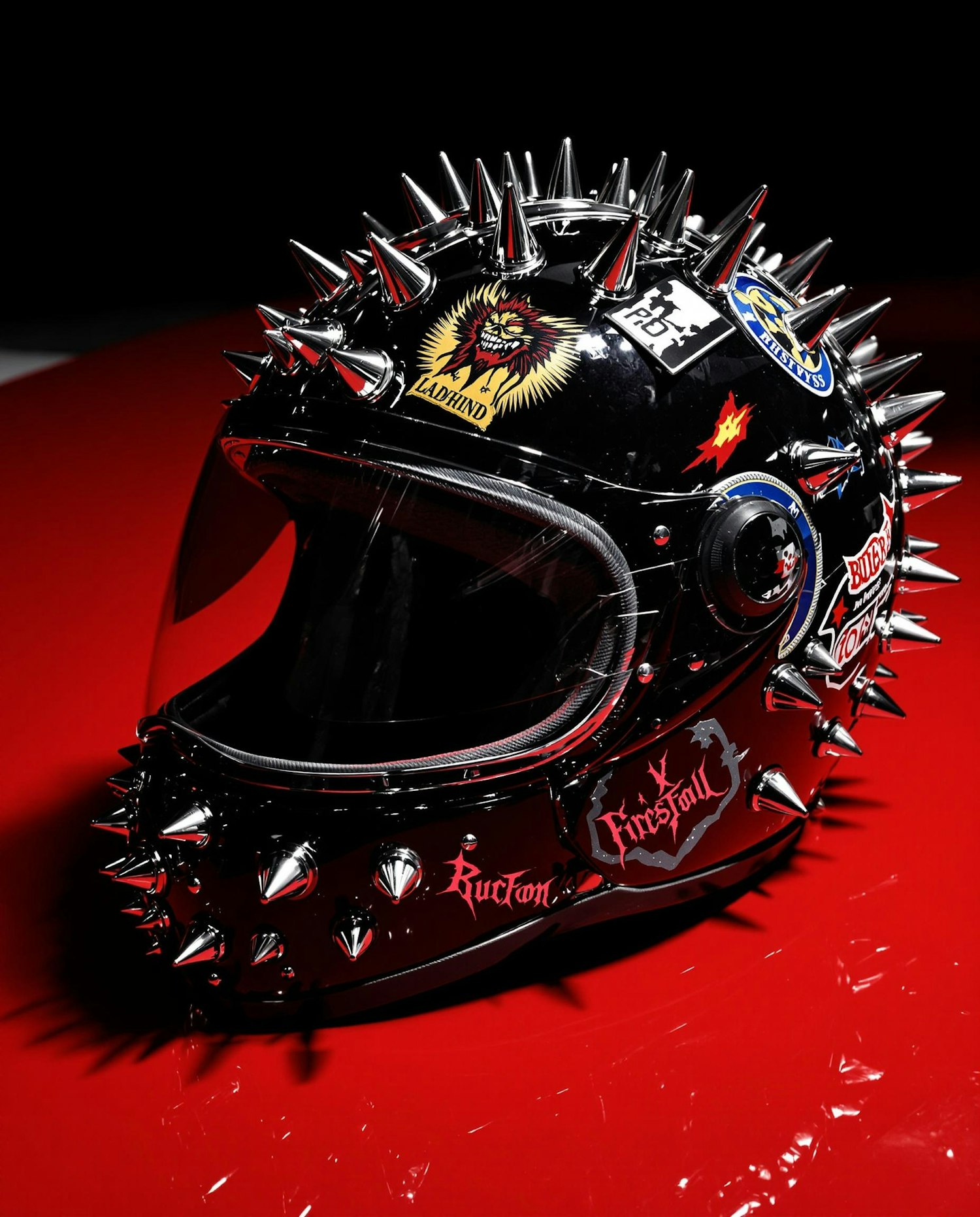 Close-up of a glossy black motorcycle helmet adorned with silver spikes and punk patches, placed on a red lacquer table under harsh studio lighting, dramatic shadows and highlights.
