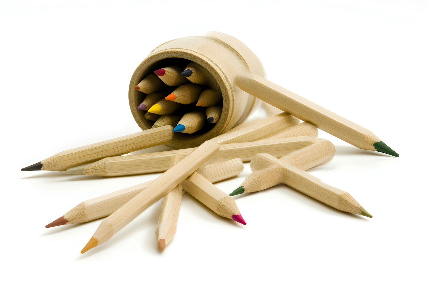 Scattered colored pencils spill from a wooden container on a white background, showcasing vibrant tips in a casual arrangement.