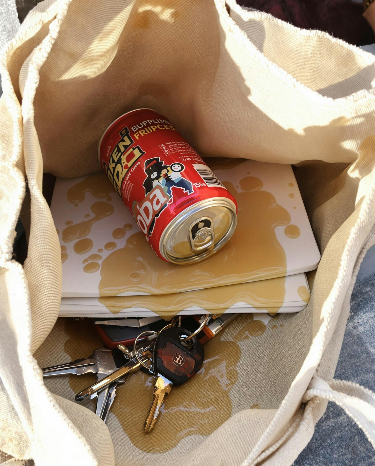 A canvas bag with spilled soda from a can onto a laptop and keys, creating a sticky mess. An everyday accident nicely captured.