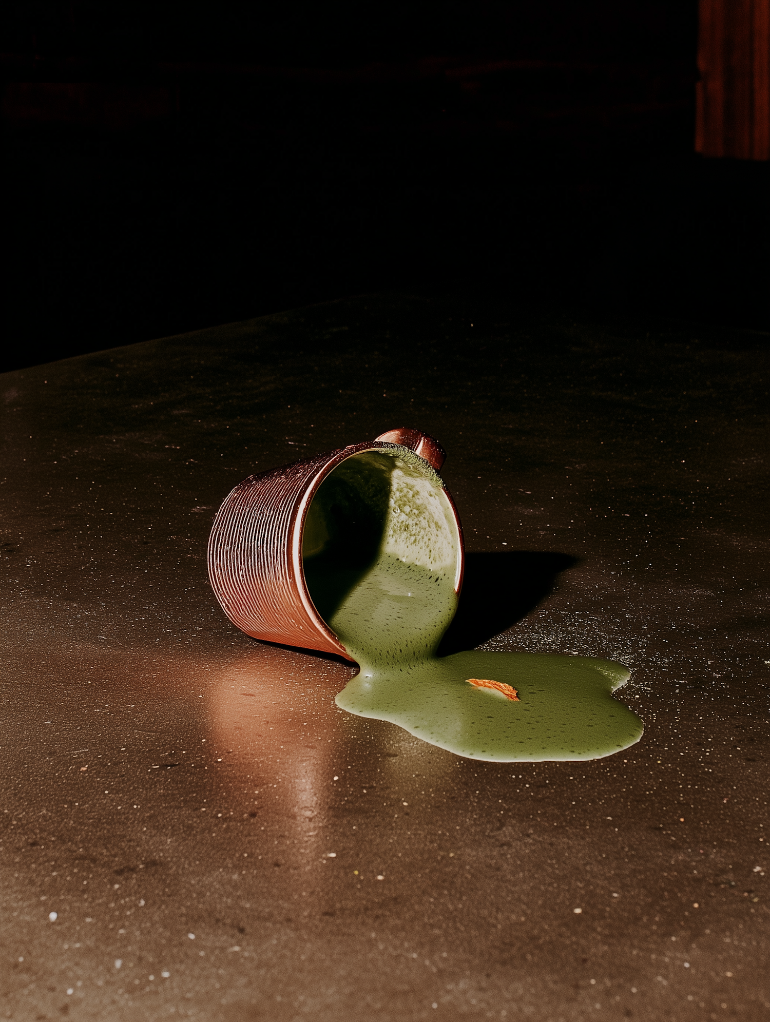 A tipped ceramic cup spills green liquid with an almond on a reflective surface, highlighted by dramatic lighting against a dark background.