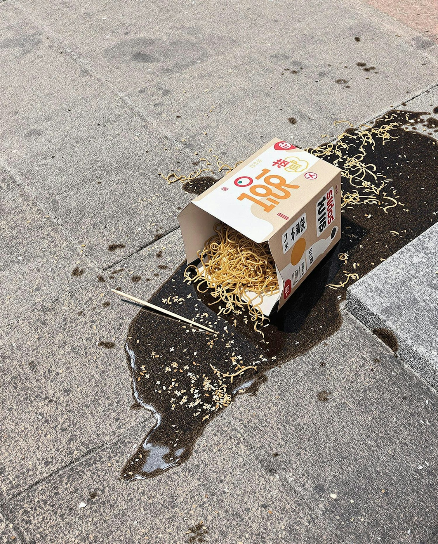 Spilled takeout noodles on a street, with a vibrant box and chopsticks lying on a gritty pavement amidst a sauce spill.
