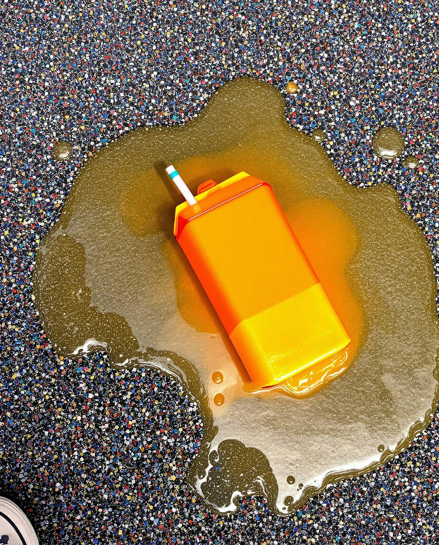 A spilled juice carton against a speckled background, displaying vibrant colors and textures, attracting attention with its realistic detail.
