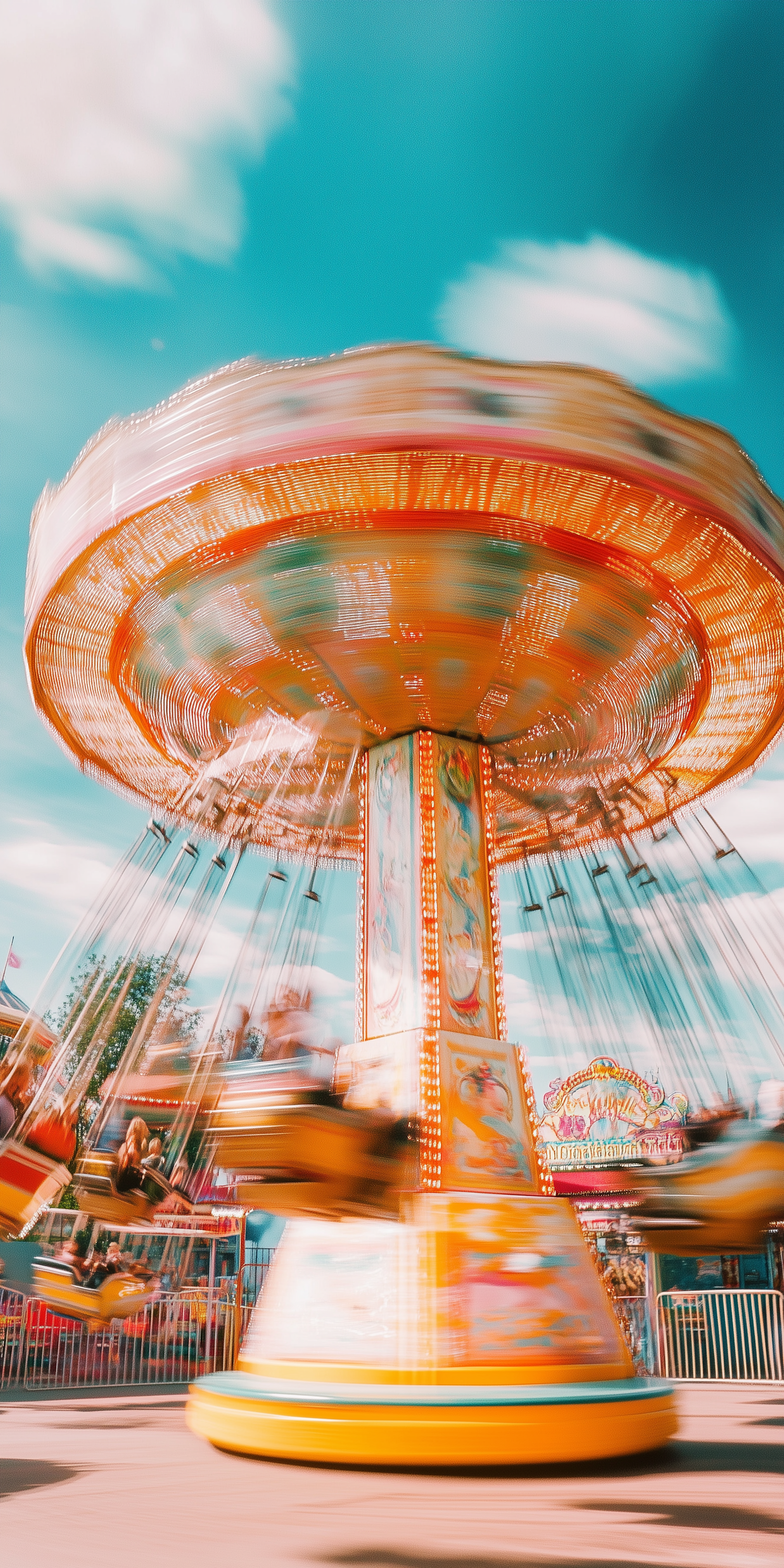Colorful spinning swing ride at an amusement park with motion blur, set against a bright blue sky with fluffy clouds.