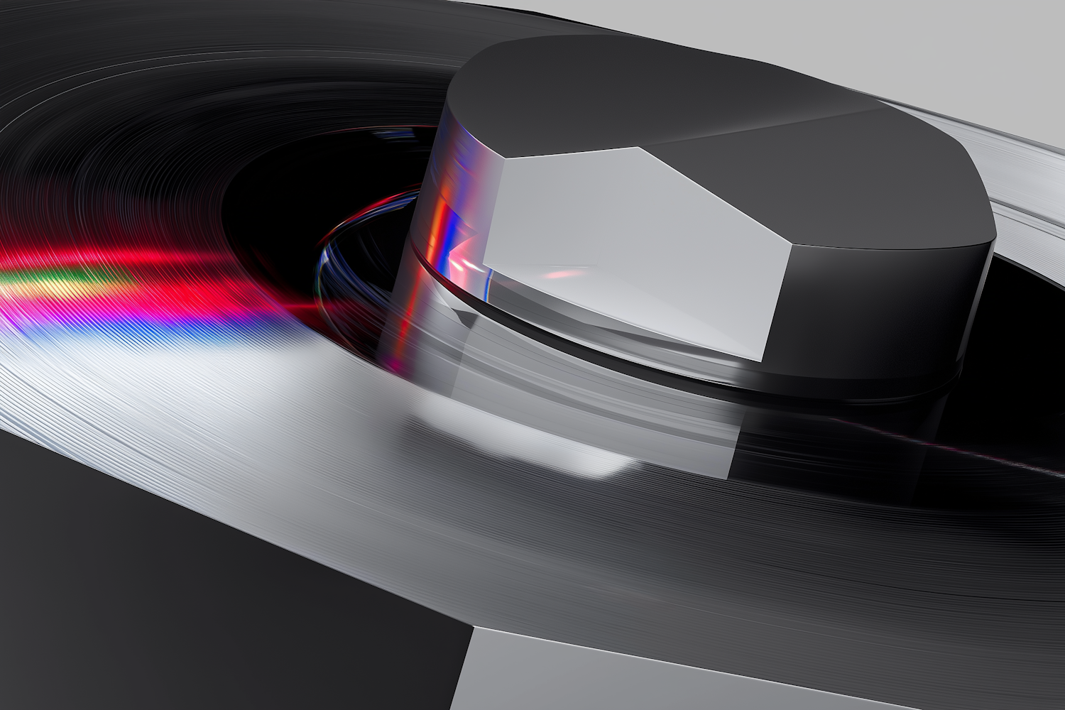 Close-up of a spinning vinyl record with a stylus, showcasing grooves and refracted light creating a colorful, dynamic visual effect.
