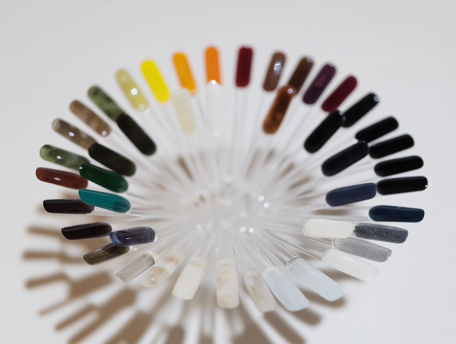 Stylized display of nail sampler sticks arranged in a spiral, showcasing a bright spectrum of colors on a clean, minimal background.