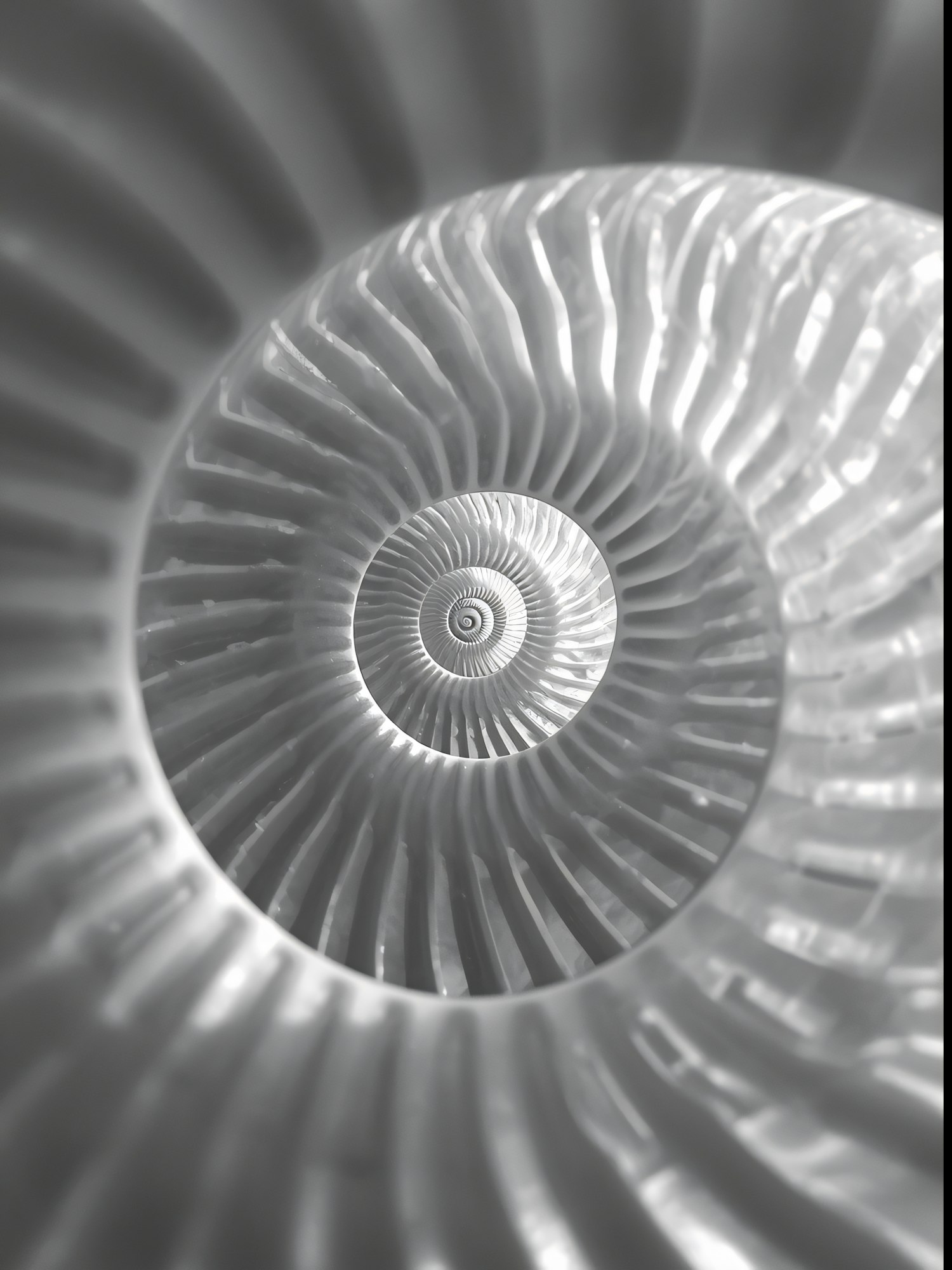 A captivating spiral design in grayscale, showcasing intricate patterns and symmetry, resembling a nautilus shell.