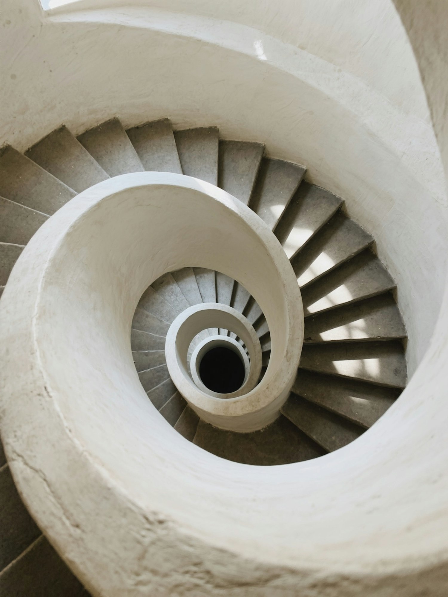 A mesmerizing spiral staircase with light plaster walls and dark stone steps, viewed from above, creating a stunning geometric pattern.