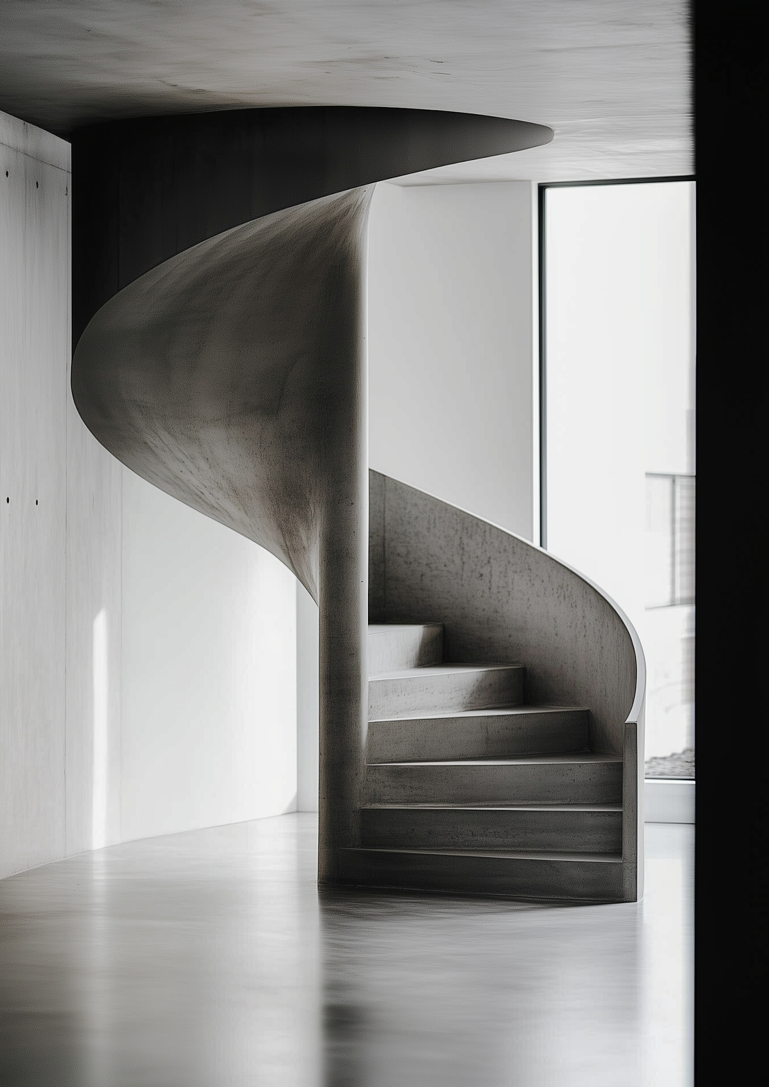 Elegant concrete spiral staircase in a minimalist setting with soft lighting and a neutral color palette.