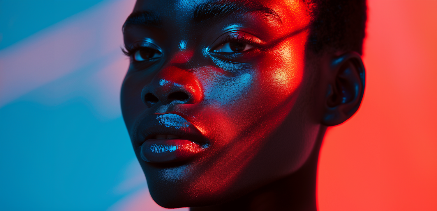 Striking portrait with vibrant red and blue lighting highlighting a calm, introspective expression on a dark-skinned individual.
