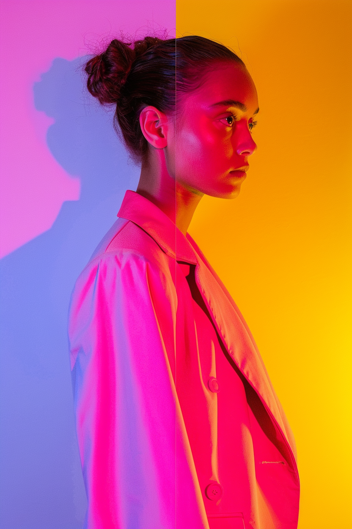 A young woman in a pink-lit profile against a split purple and yellow background, creating a striking visual contrast.