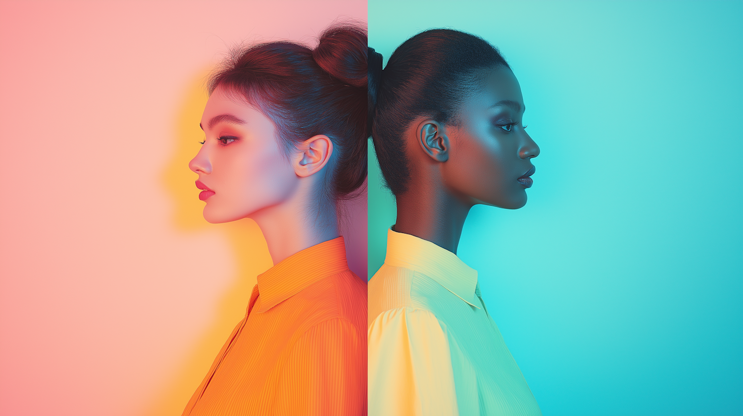A vibrant split-screen portrait of two women in profile, contrasting warm and cool tones with striking lighting and bold colors.