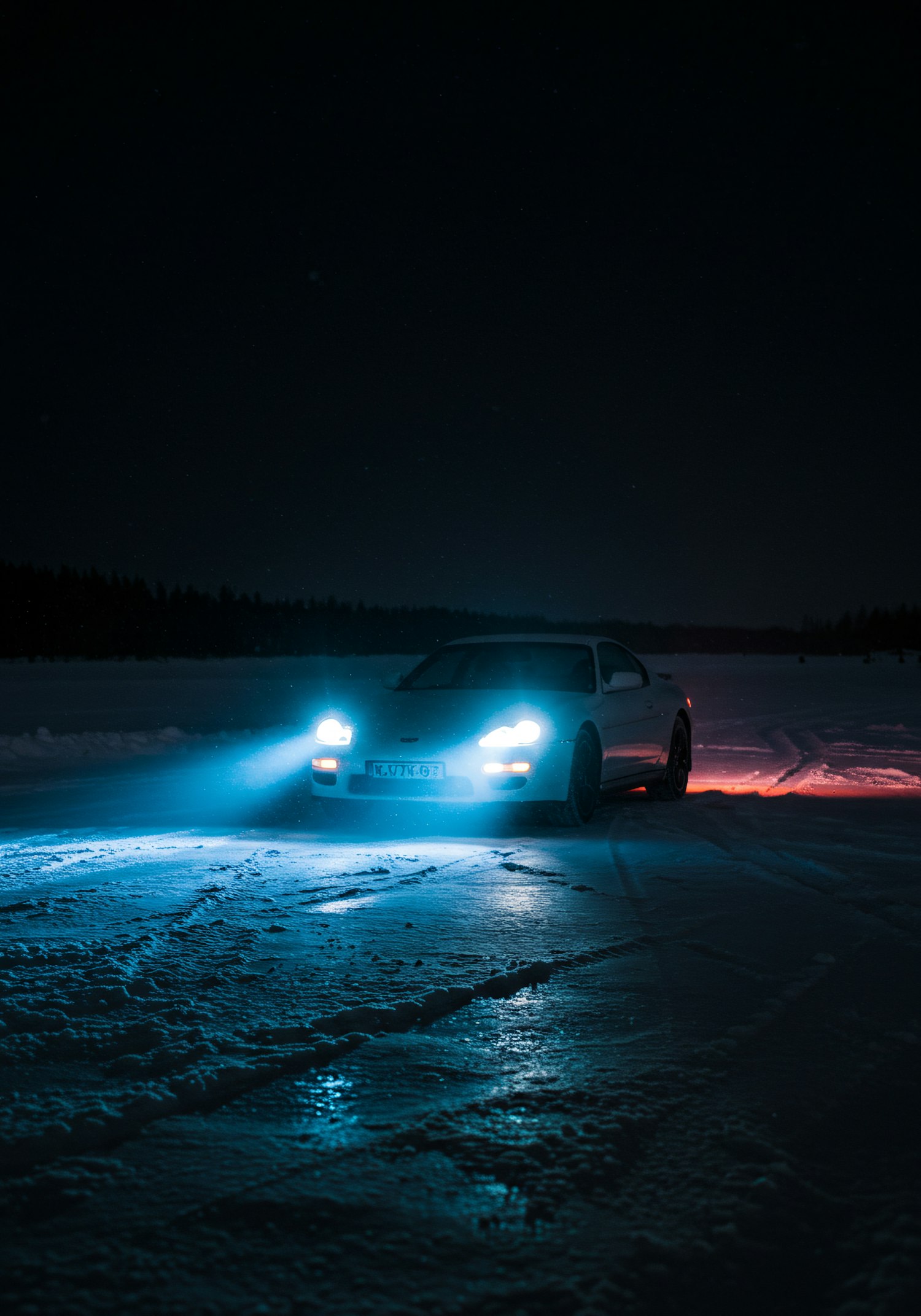 A white sports car with bright blue headlights on a snowy night, creating a dramatic contrast with the dark surroundings and icy ground.