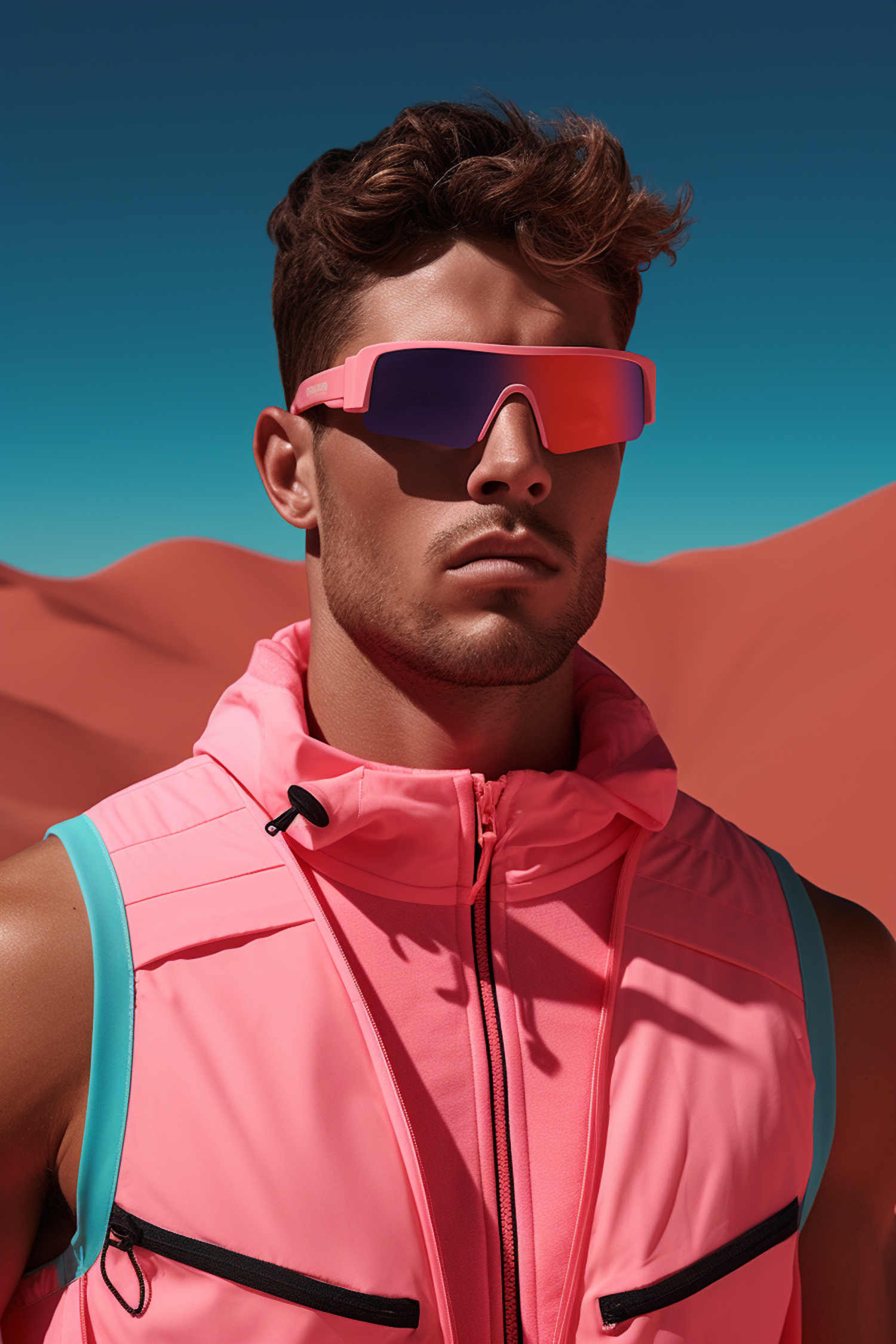 Stylish man in pink vest and futuristic sunglasses against red sand dunes and blue sky, showcasing modern fashion in a desert setting.