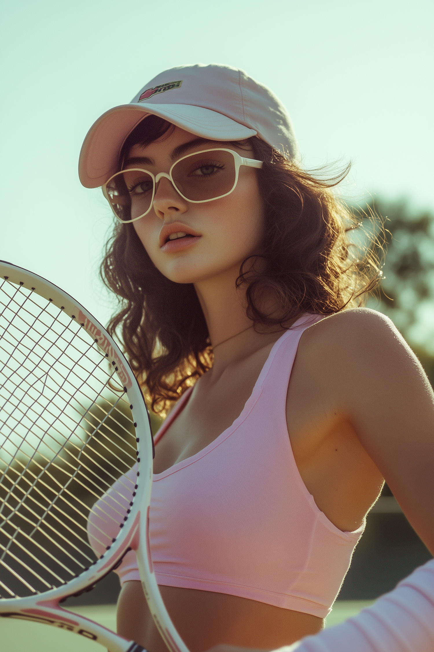 Stylish woman in pink sportswear and sunglasses holding a tennis racket outdoors on a sunny day.