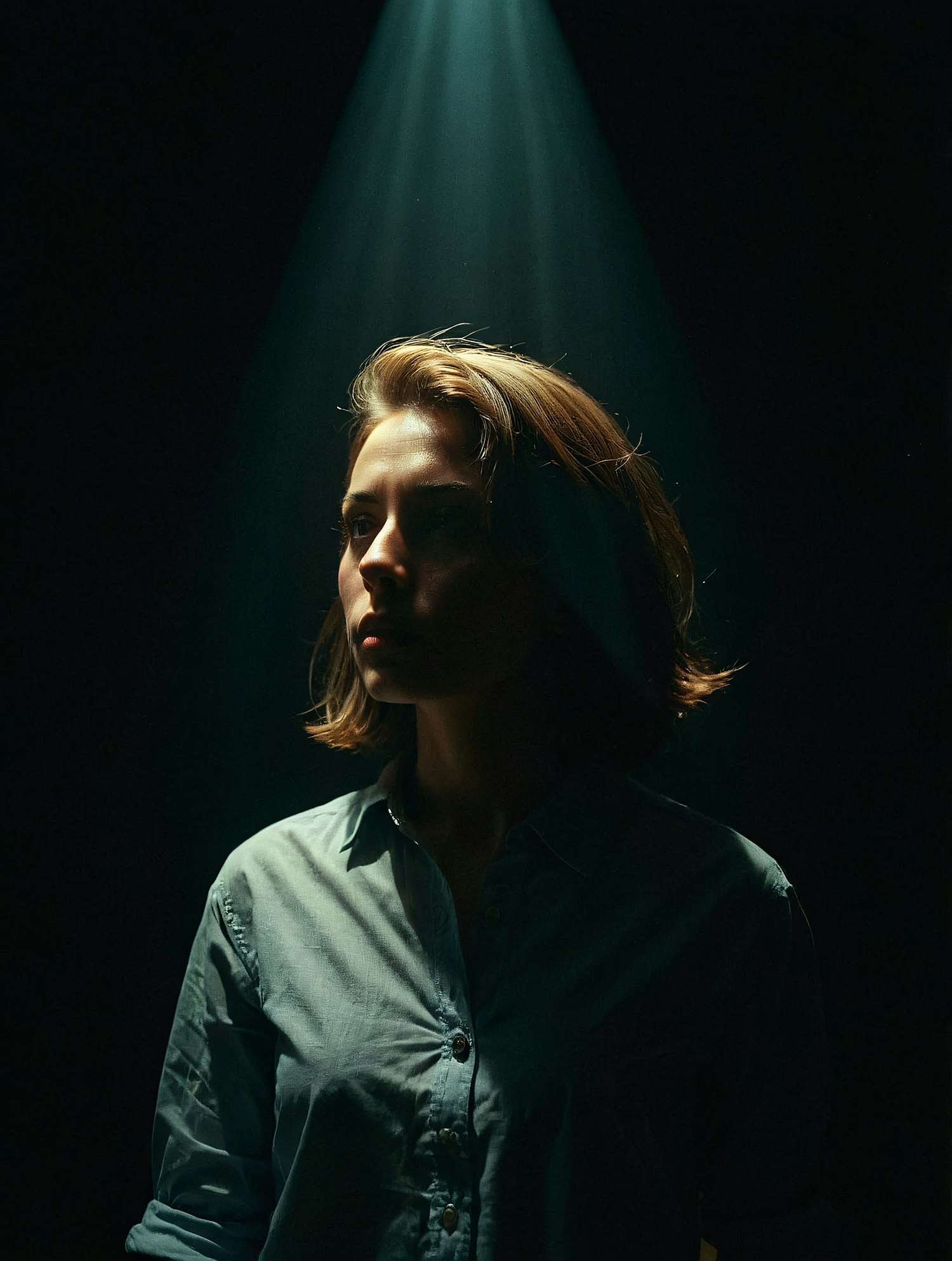 A contemplative woman in a light blue shirt stands under a dramatic spotlight in a dark setting, creating a cinematic and moody atmosphere.