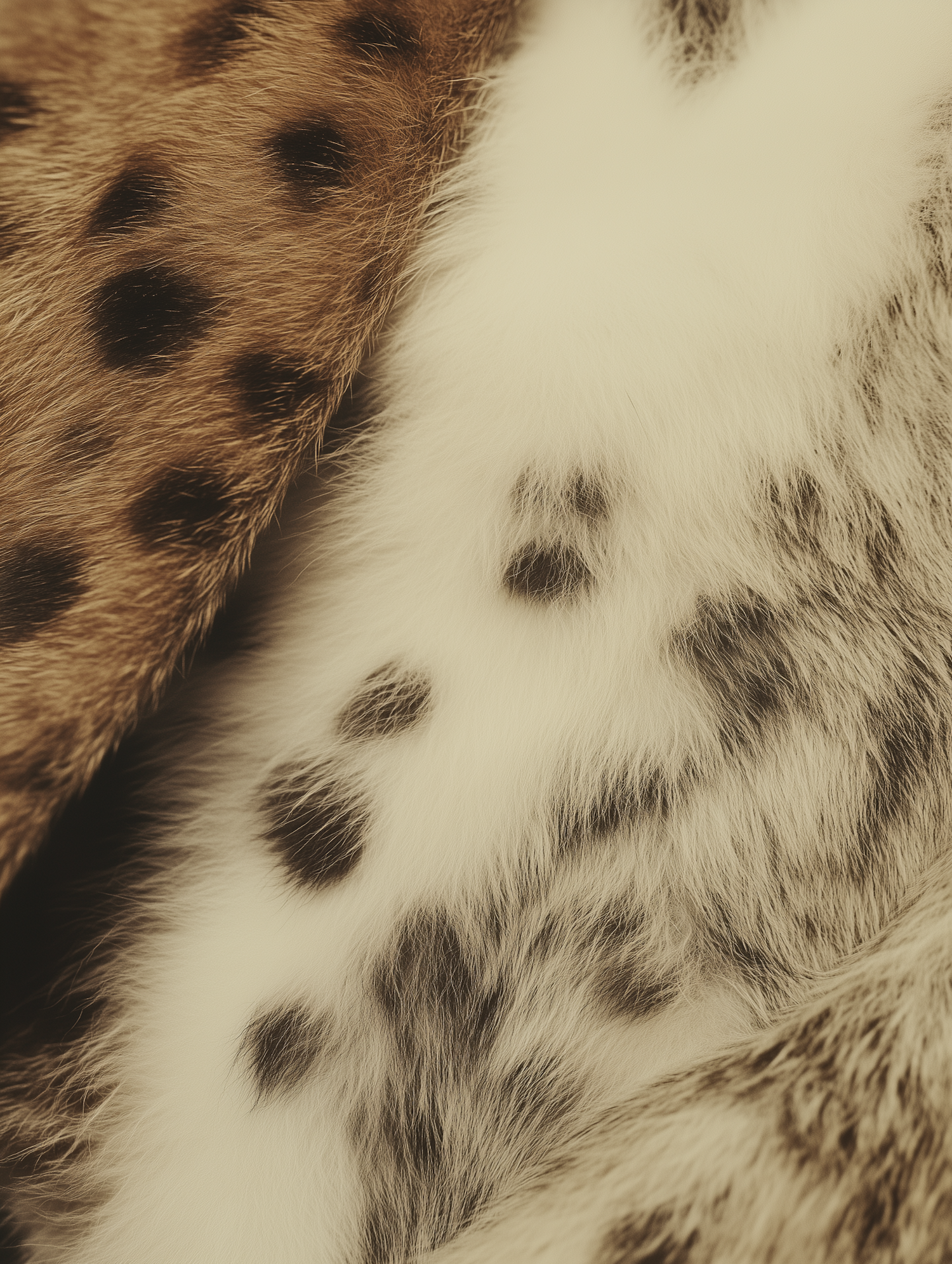 Close-up of animal fur with brown and white sections, featuring dark spots and fine textures, showcasing natural patterns and contrasts.