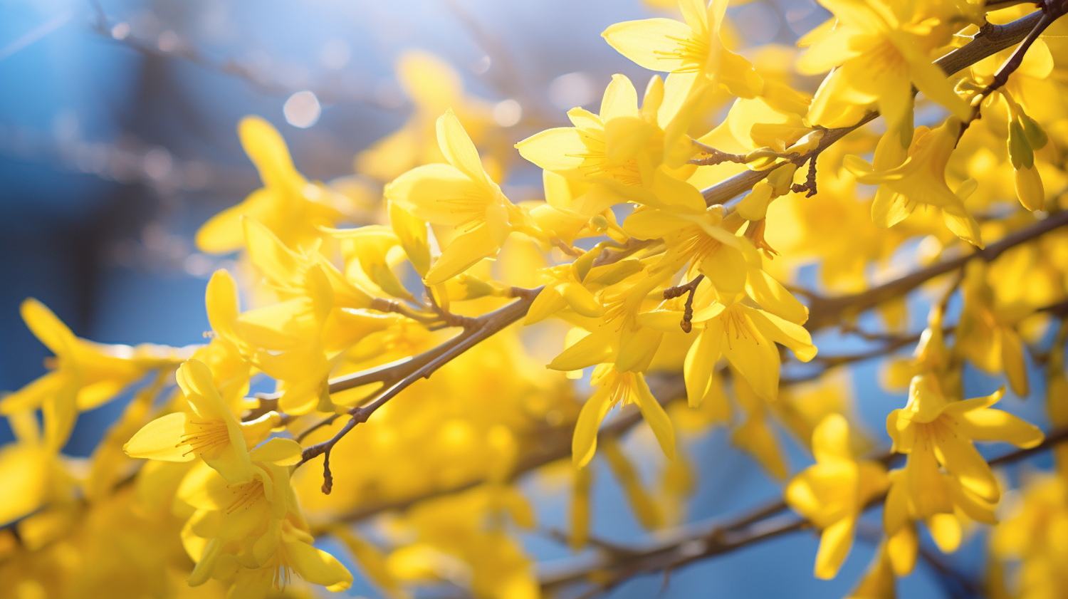 Bright yellow flowers on branches against a soft blue background, capturing the essence of spring and renewal.