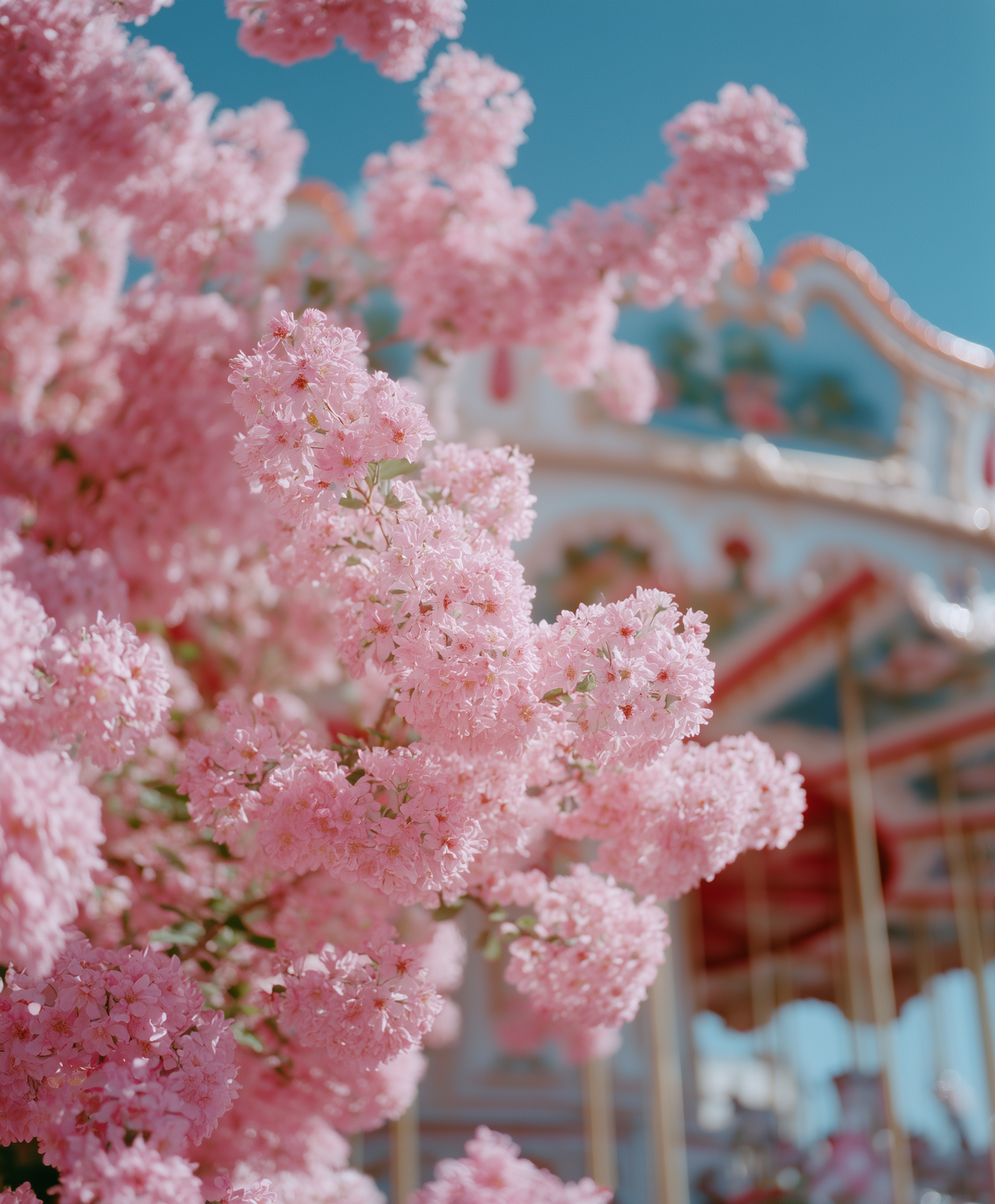 Pink blossoms in full bloom with a colorful carousel in the background under a clear blue sky, evoking a whimsical springtime charm.
