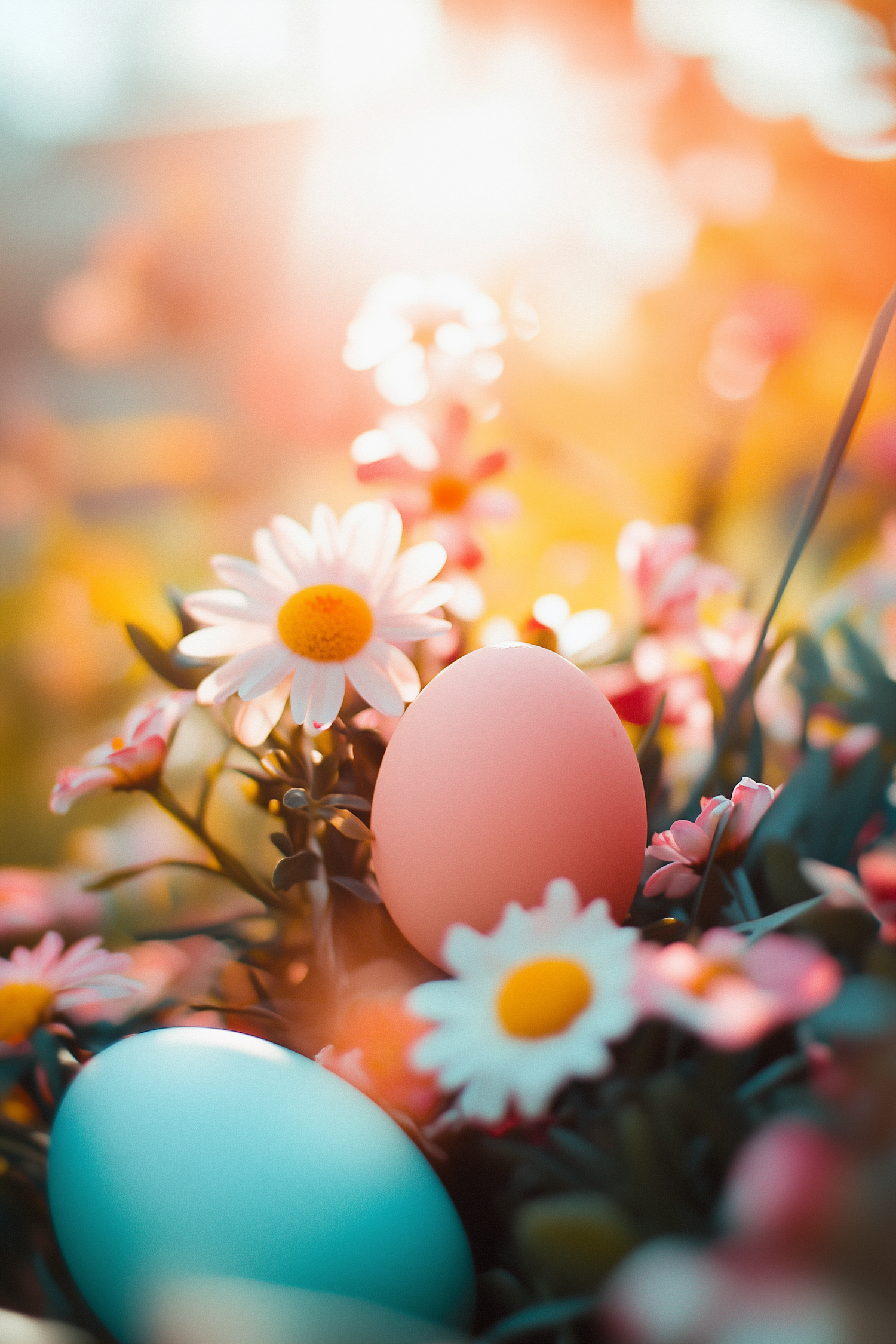 Pastel Easter eggs nestled among daisies in warm sunlight, creating a serene and vibrant spring scene.