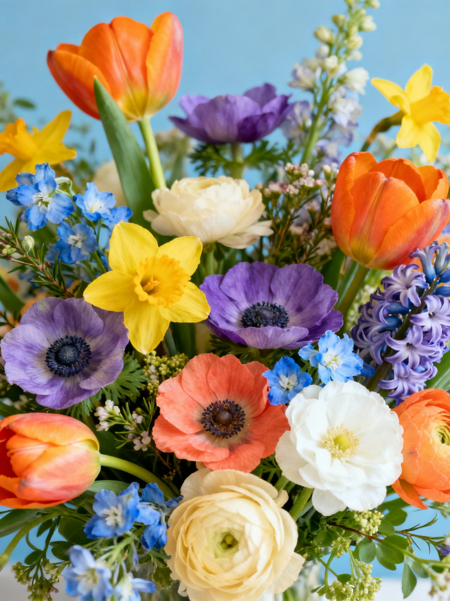 A colorful bouquet of spring flowers including tulips, daffodils, and anemones, arranged beautifully against a soft blue background.