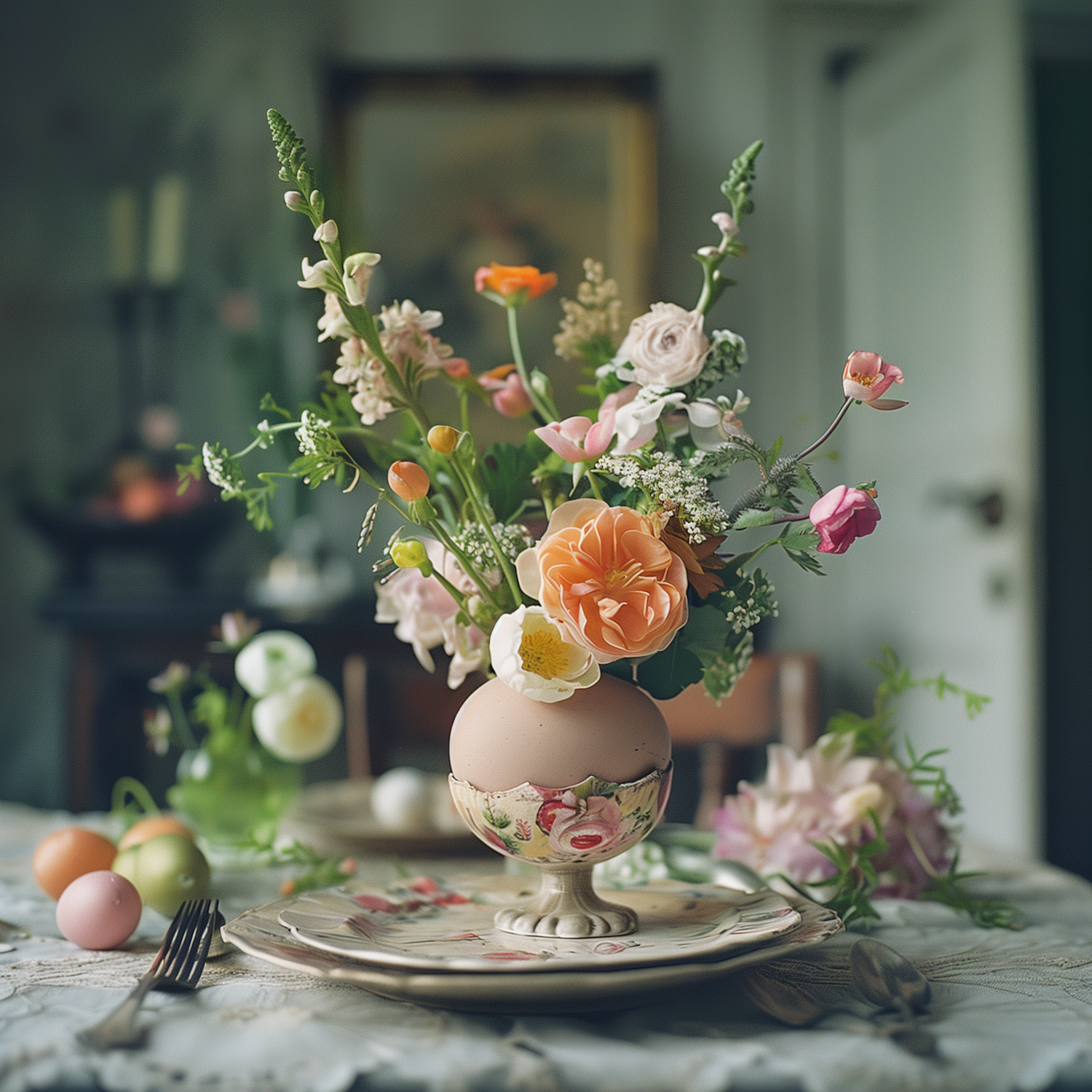 Elegant floral centerpiece in a decorative vase on a lace-covered table, perfect for spring or Easter decor.