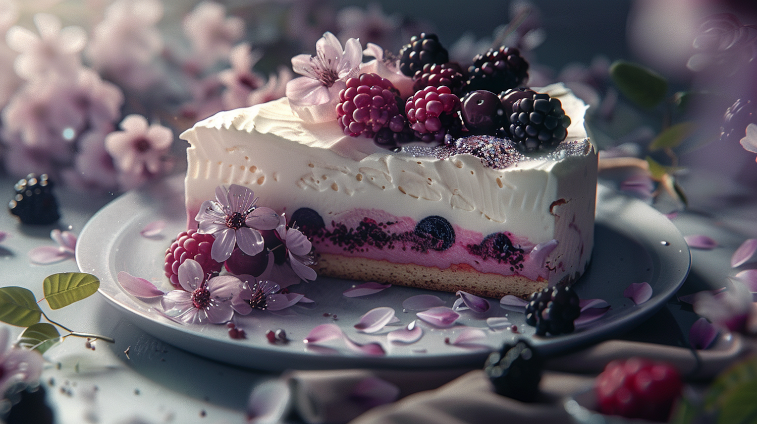 Elegant cake slice with whipped cream, berries, and pink flowers on a white plate. Soft lighting enhances the delicate presentation.