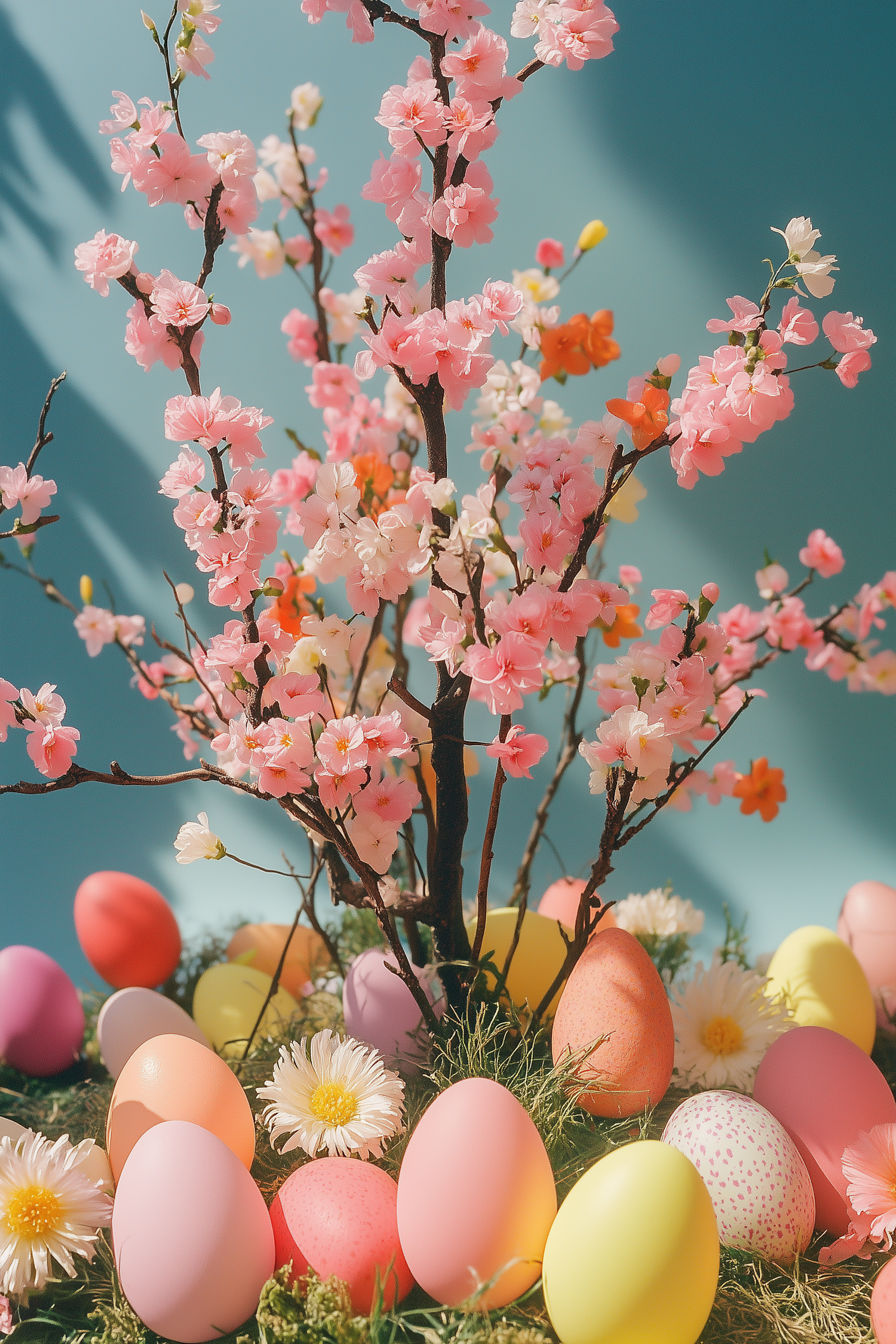 Cherry blossoms and colorful Easter eggs create a vibrant spring scene with daisies and a soft blue background.