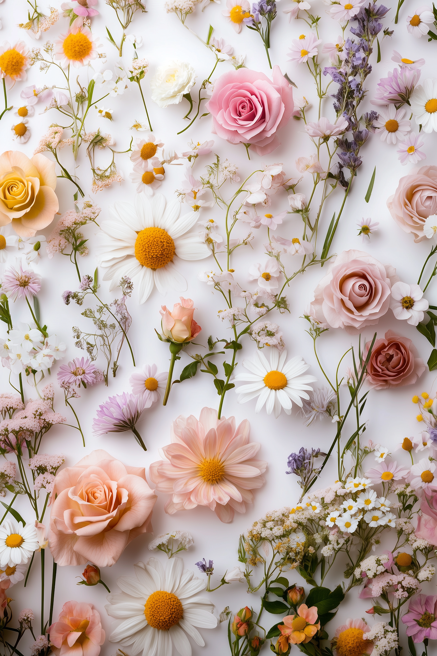 A beautiful flat-lay of assorted flowers including roses, daisies, and lavender on a white background, showcasing vibrant colors and textures.