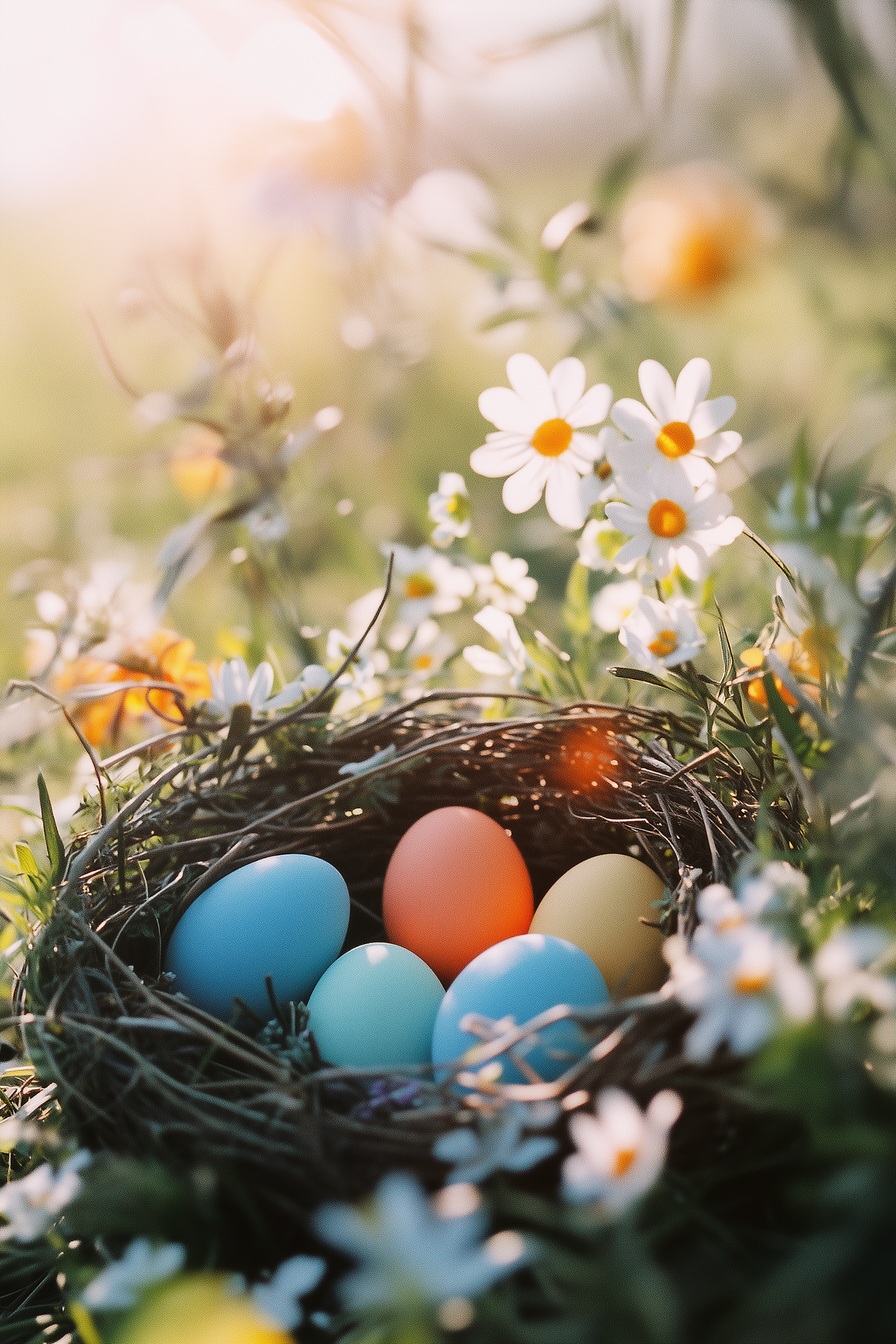 Colorful Easter eggs in a nest surrounded by daisies, bathed in warm sunlight, creating a serene springtime scene.