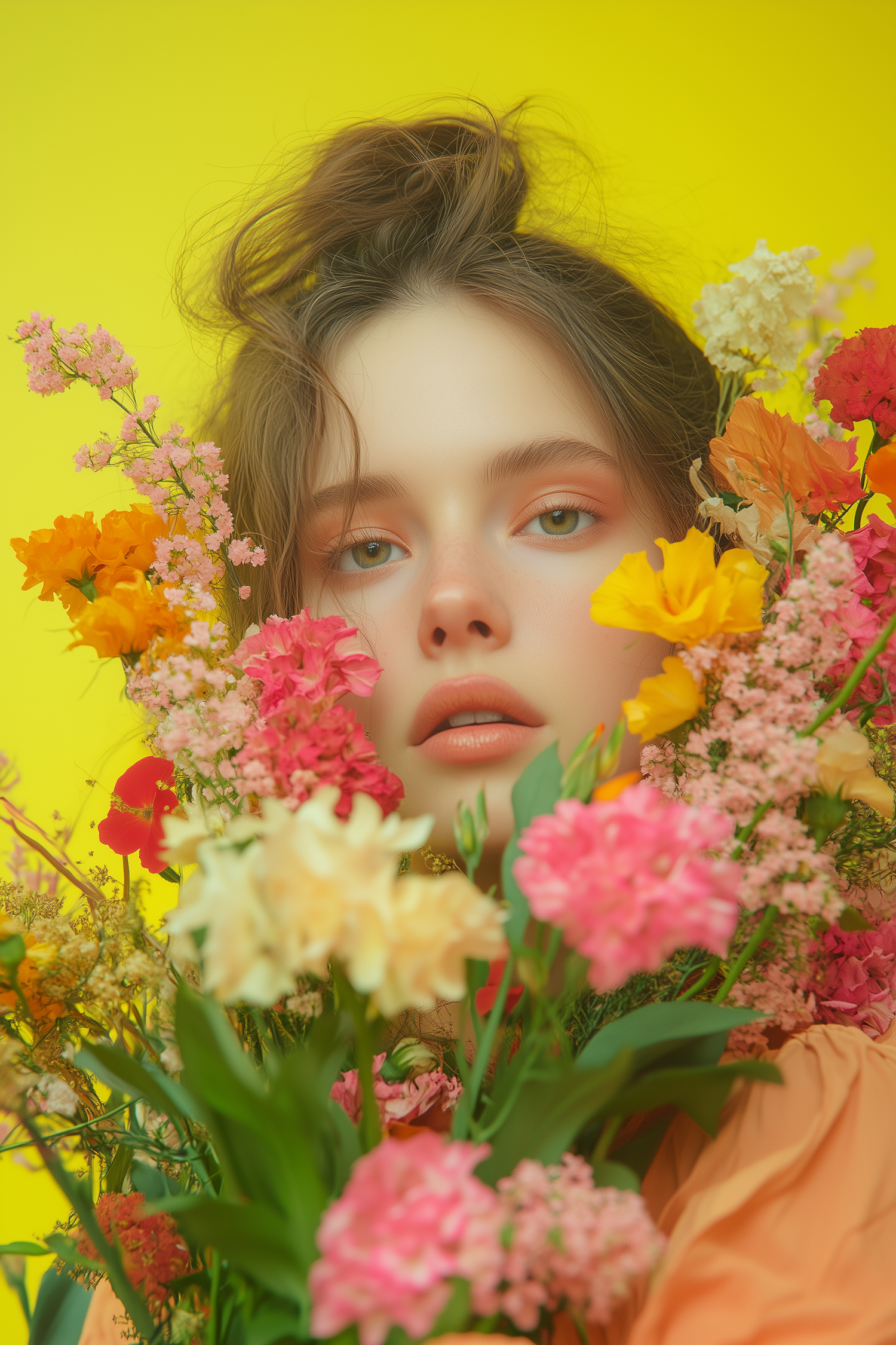 A serene portrait of a woman surrounded by vibrant flowers against a bright yellow background, evoking springtime and natural beauty.